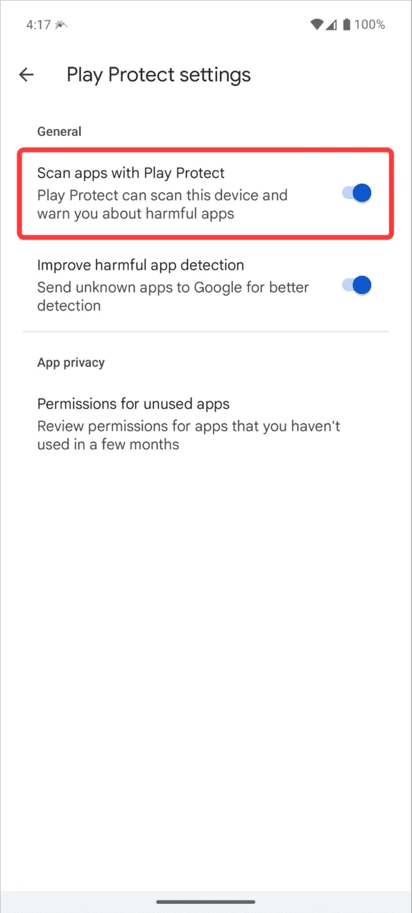 - Toggle off “Scan apps with Play Protect.”