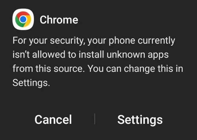 You’ll need to allow installing apps that did not come from Google Play. Tap “Settings” and allow Chrome to install unknown apps.
